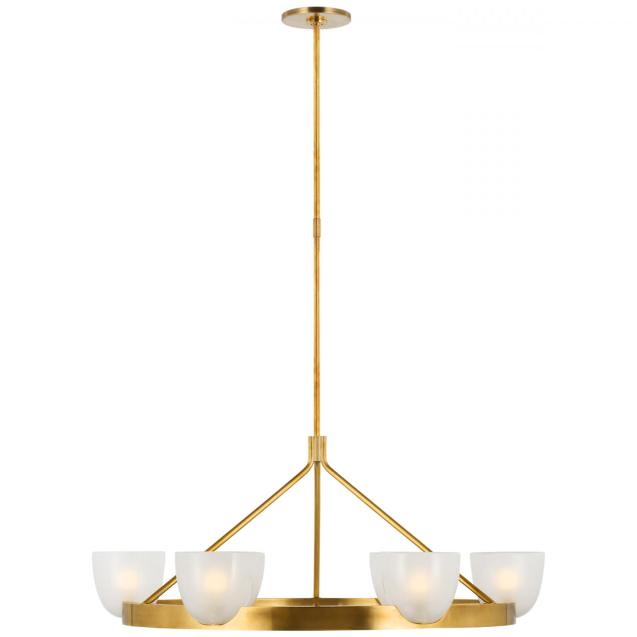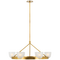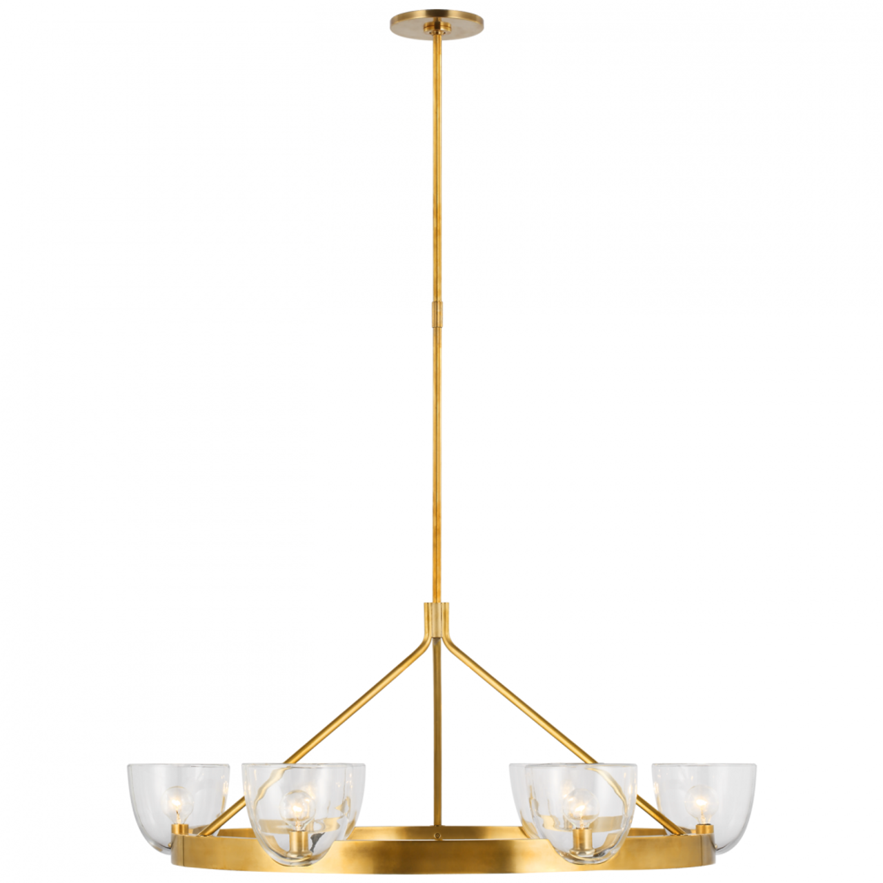The mid-century modern Carola by AERIN presents a unique design with horizontal metalwork supporting upturned shades in clear, frosted or white strié glass options. The series will add character and warm illumination to hallways or large rooms alike.