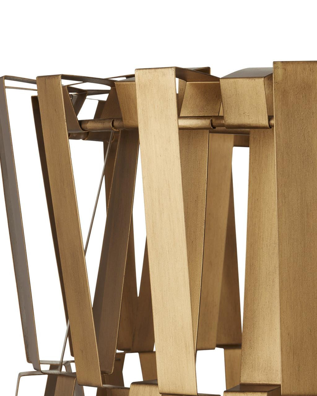 As complex as a profile gets, the Chaconne Brass Chandelier has a circumference ringed in folded metal straps. Each piece is bent seven times to achieve the shape that is then wrapped around the frame. This is a labor-intensive process that takes a tremendous amount of concentration to ensure that the interconnecting straps end up the exact same length. Brightening the overall composition is the brass finish. Adjustable from 28.5" to 96.5" with use of included chain/rod kit/cable. If your space calls for a longer drop, additional chain/rods/cable is available for purchase.