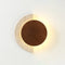 The Crescent Halo Wall Sconce by yovinolight merges yellow travertine with a circular wooden accent, creating a serene blend of natural materials and contemporary design.