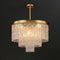 The Giovanni Grande Chandelier is a midcentury marvel. It features K9 glass with a textured finish, creating a beautiful, diffused light. Its solid brass frame and linear architectural tiers make it a striking addition to any home decor.