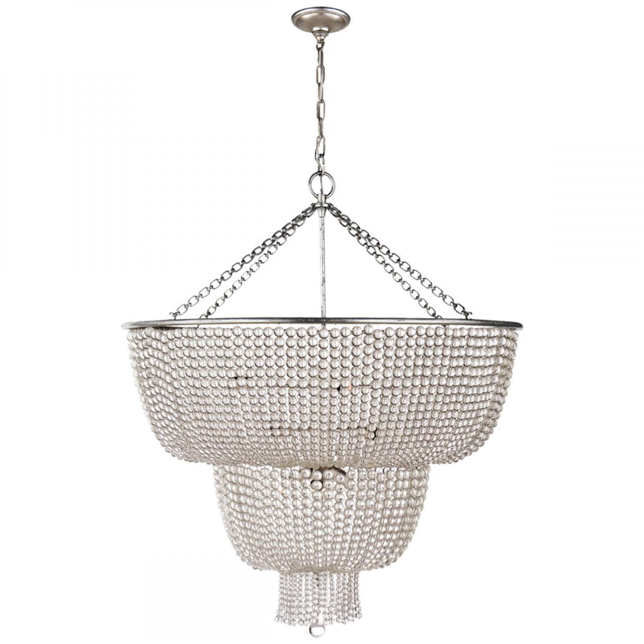 The Jacqueline by AERIN offers non-traditional lighting options that combine 1920s style with modern simplicity. The unique pieces feature cascading beads that drape elegantly from a framework in hand-rubbed antique brass or silver leaf. The exquisite trim is available in opaque or transparent glass beads, adding the desired dramatic flair to enhance any bedroom, living room or dining room with shimmering sophistication.