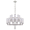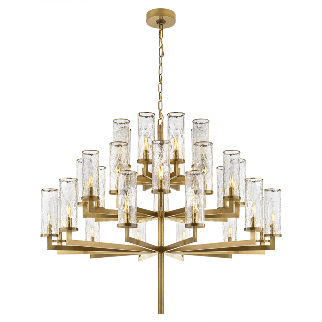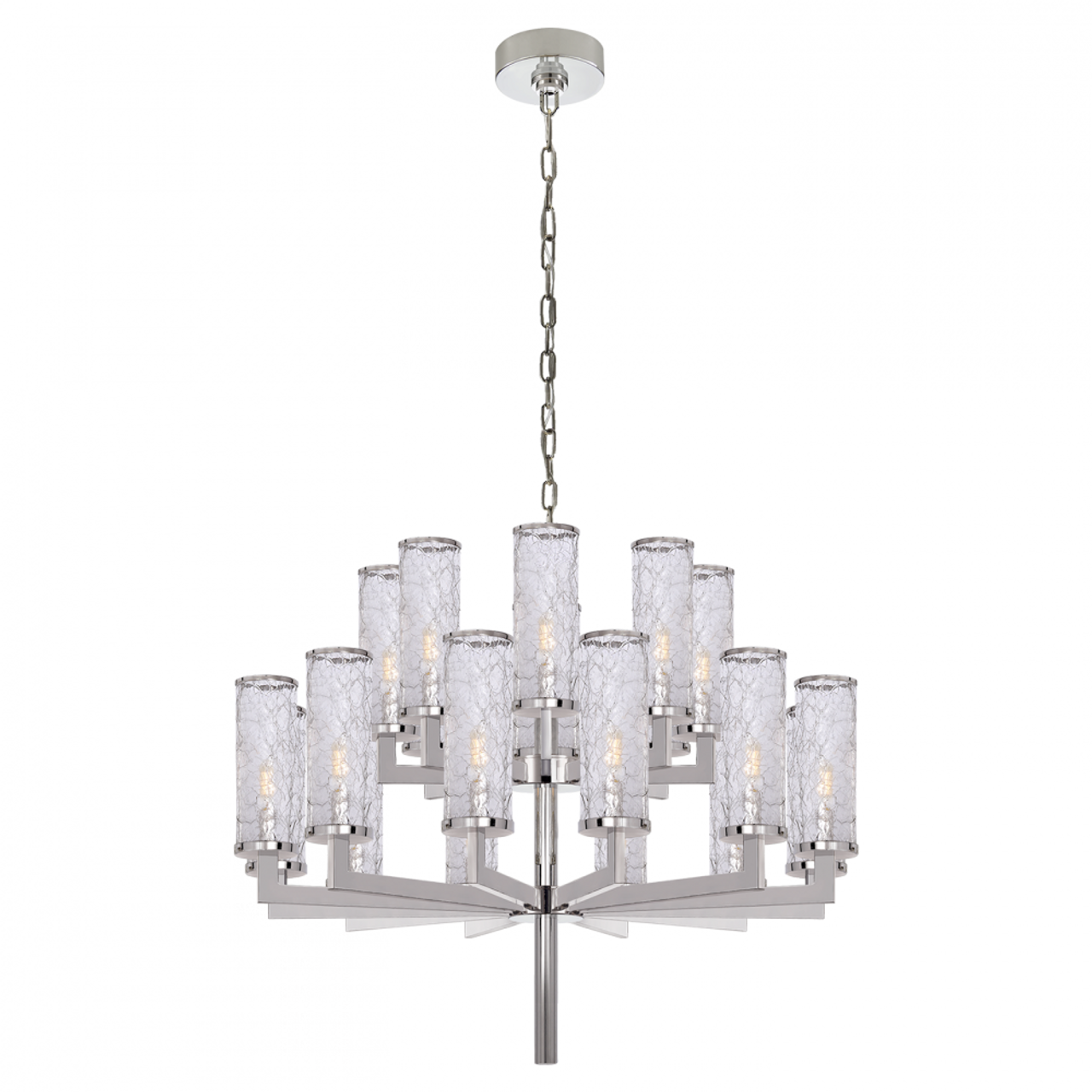 The Liaison Chandelier makes a statement with its impressive scale and many right angles. The metal frame is very simple, allowing the crackle glass shades to come forward as a functional and decorative part of the fixture. The textured glass diffuses the illumination in a unique way, as well as giving a distorted view of the bulbs that is evocative of candlelight.