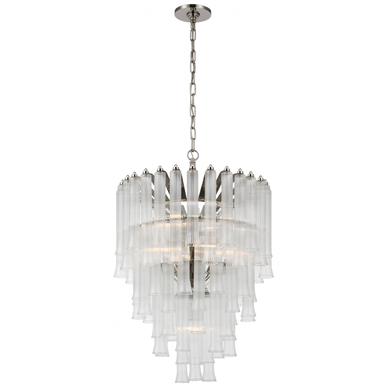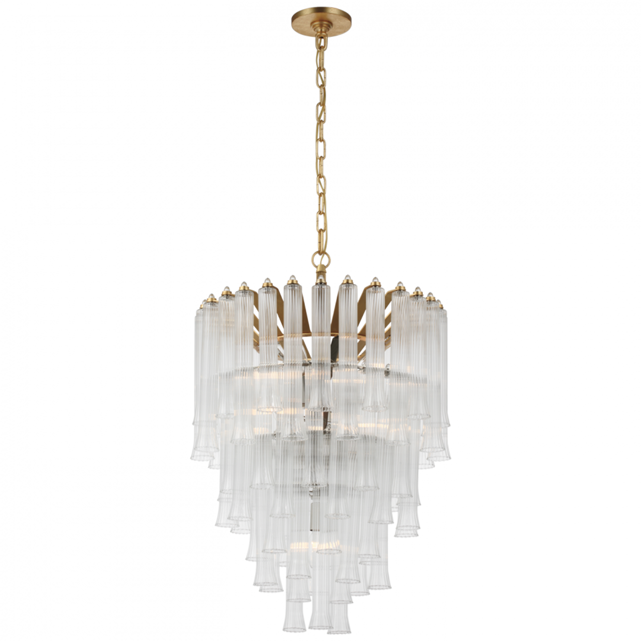 The Lorelei by Julie Neill showcases elegant, fluted glass tubes thoughtfully arranged in cascading, concentric circles around a polished frame. Reminiscent of art deco fringe, the fixtures will lend a decadent touch to any space, both small and grand rooms alike.