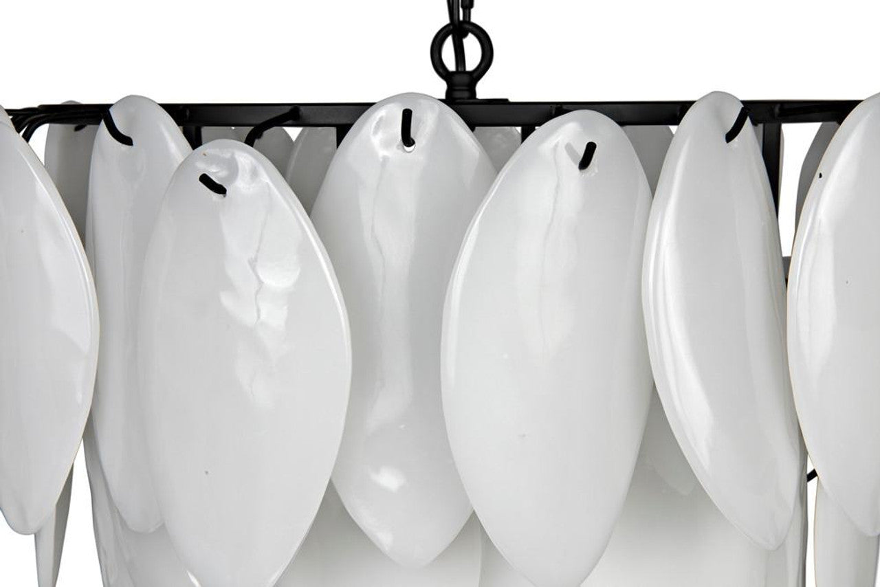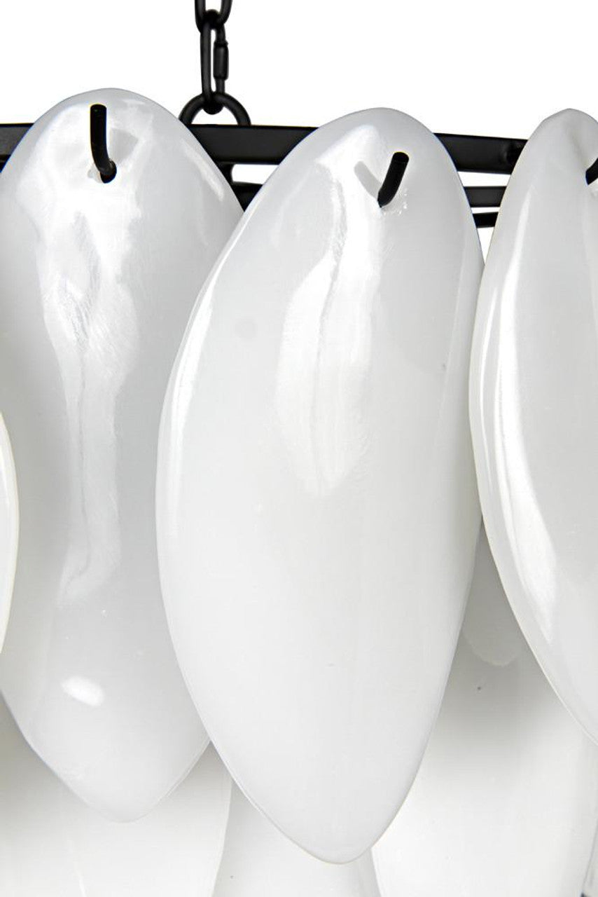 Add a strong sculptural element to any contemporary decor with this striking chandelier from Noir. Each is handcrafted of metal & milk glass. Modern & bold, its intriguing lines add style to your decor even when the bulbs within remain unlit.