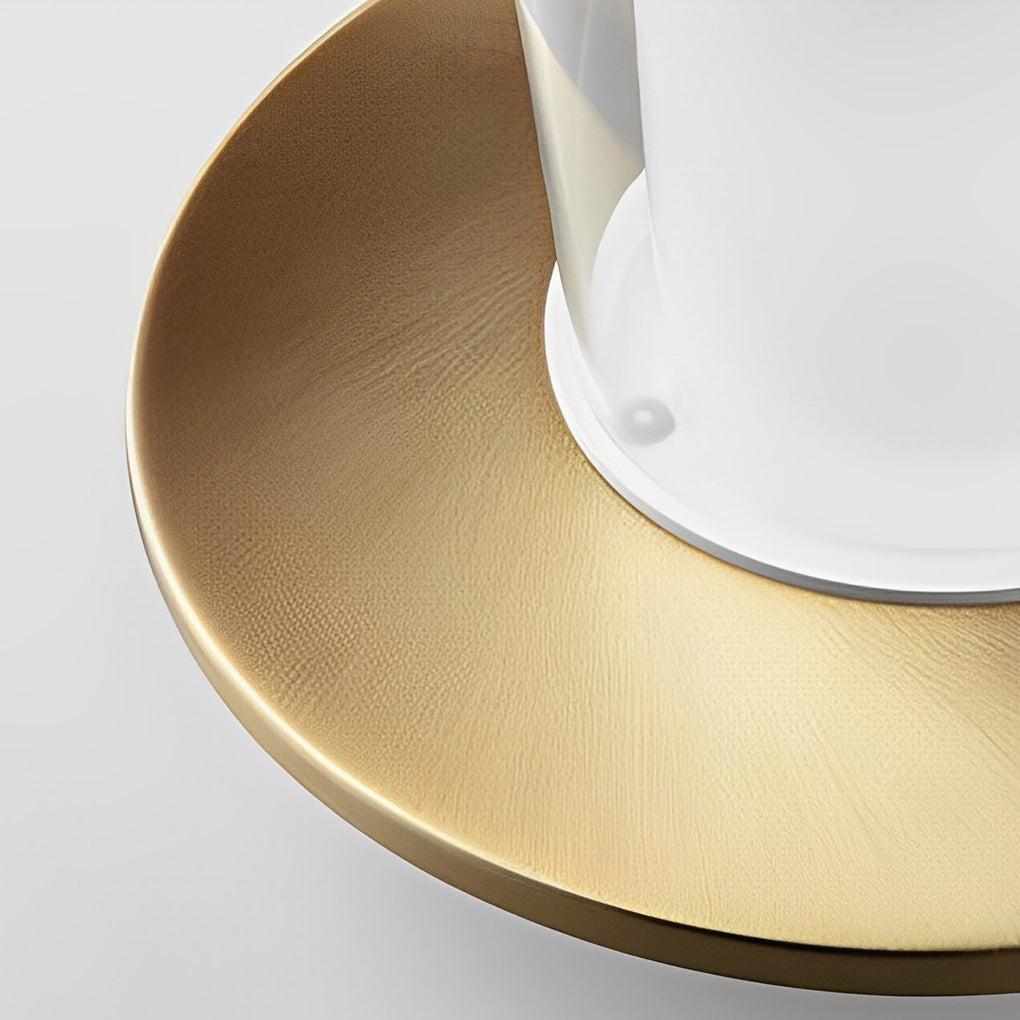 • The simple, cylindrical shape of this double layered plastic shade table lamp is the perfect accent for modern decor. The contemporary look is elegant with a brass or nickel metal dish base. The short design is ideal for placement on a nightstand, desk, or accent table.