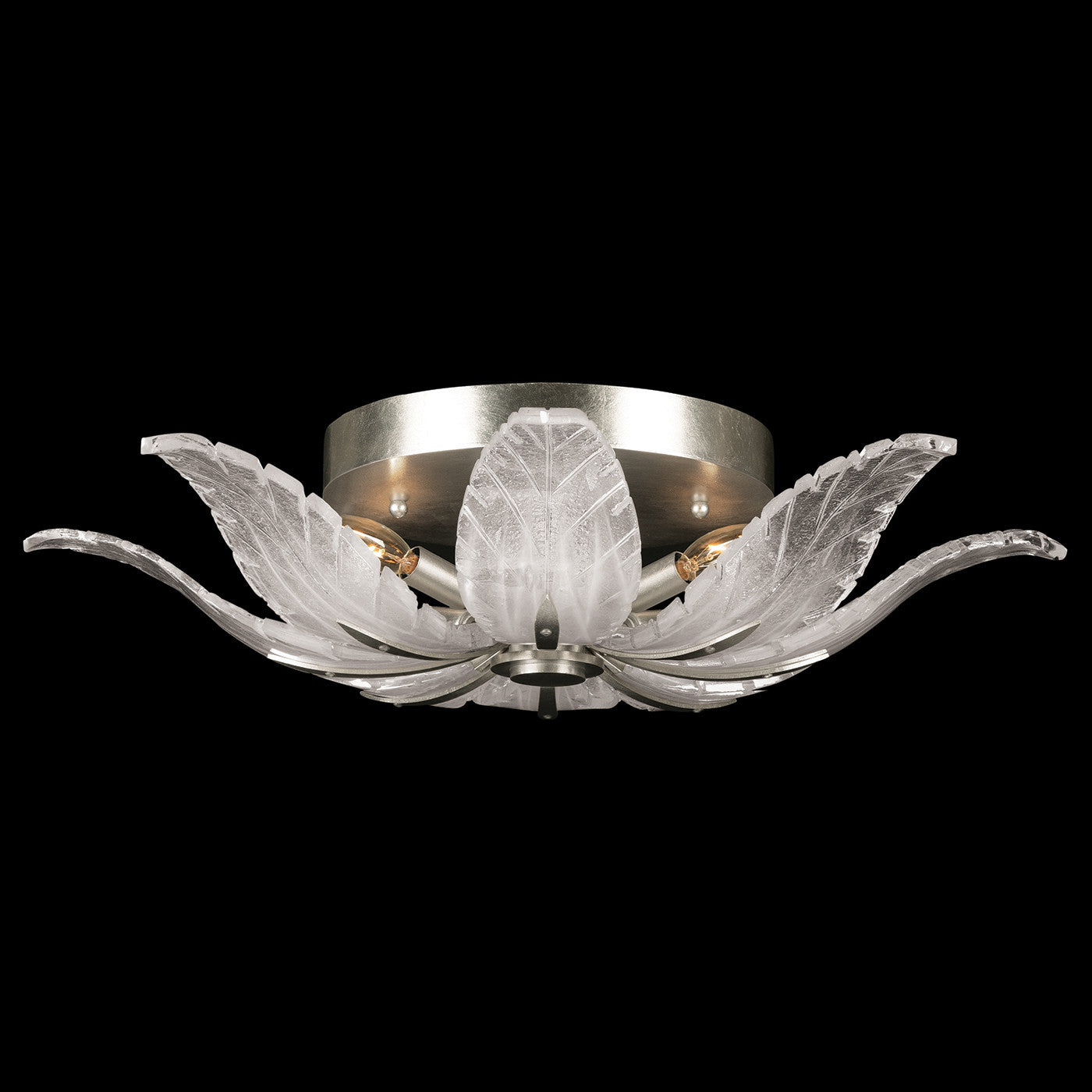 Interweaving signature Fine Art studio glass with the noble element of our handmade metal fabrication, this semi flush combines classical lines with a contemporary glass design. Available in Silver and Gold finish with either Dichroic Feathers or White Feathers.