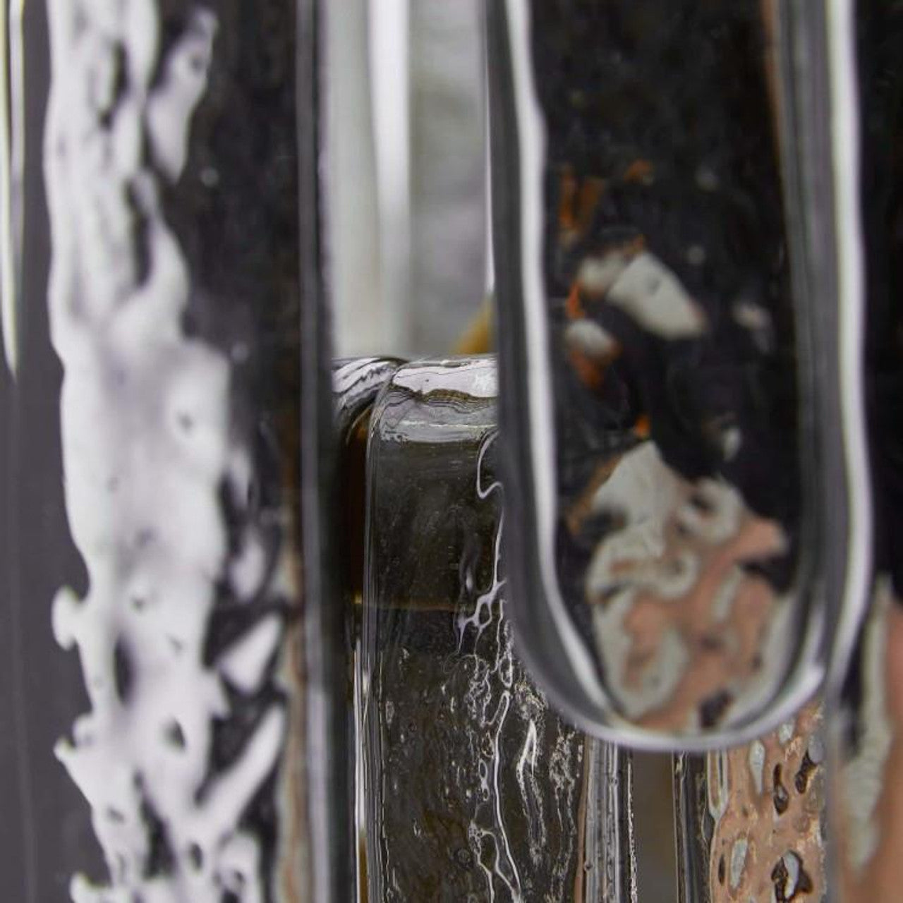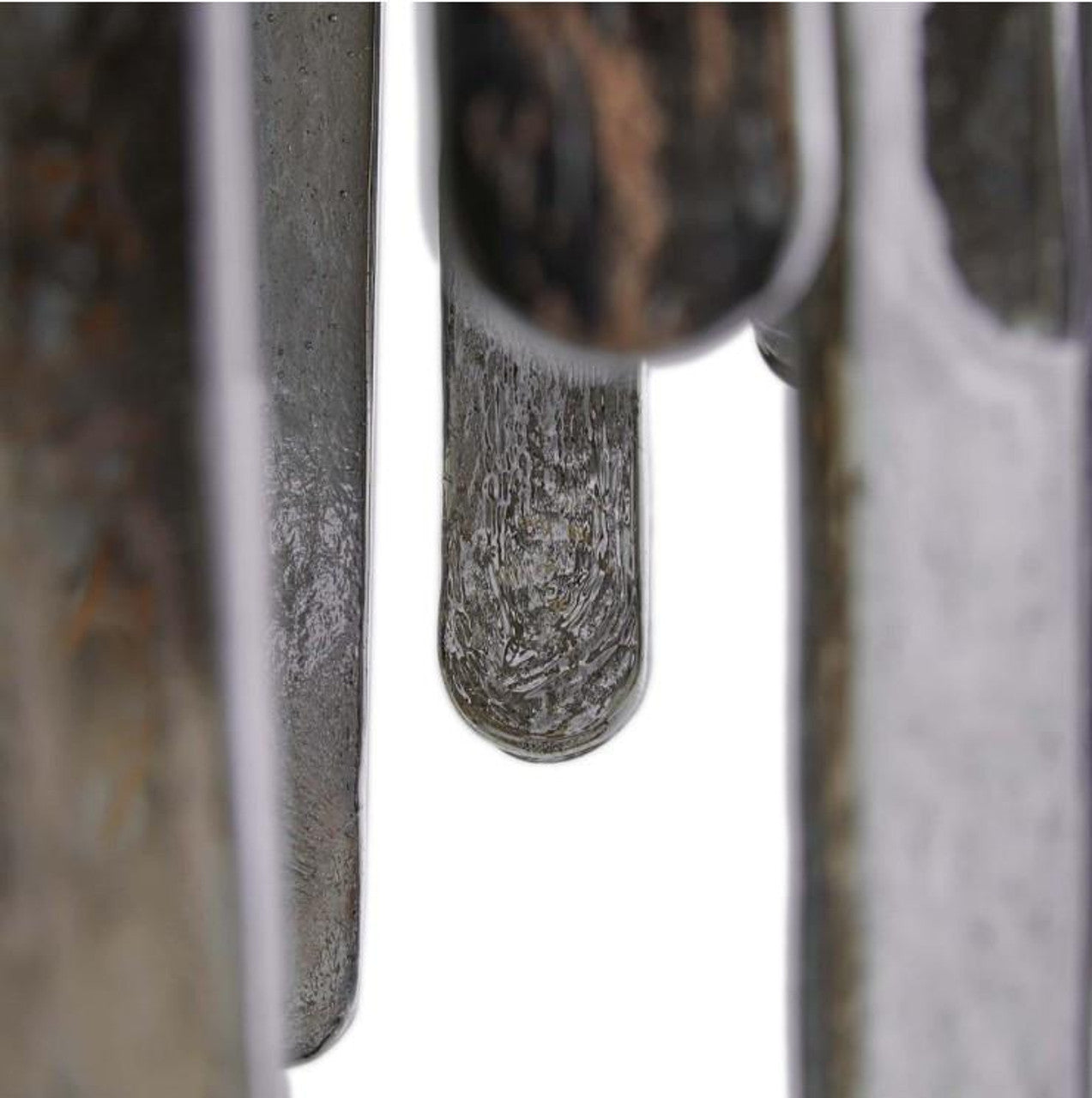 Our raine chandelier was inspired by the vintage murano glass lighting made popular in the '60s and '70s. The tear-drop silhouette is embellished with rounded layers of lustrous, blue smoke seedy glass, in staggered sizes, that fold over a tiered iron frame, which is finished in antique brass. The result is a dramatic and textural waterfall effect. The glass pieces can be removed to provide additional illumination if desired. Finish will vary. Damp-rated, although limited covered outdoor areas may affect finish.