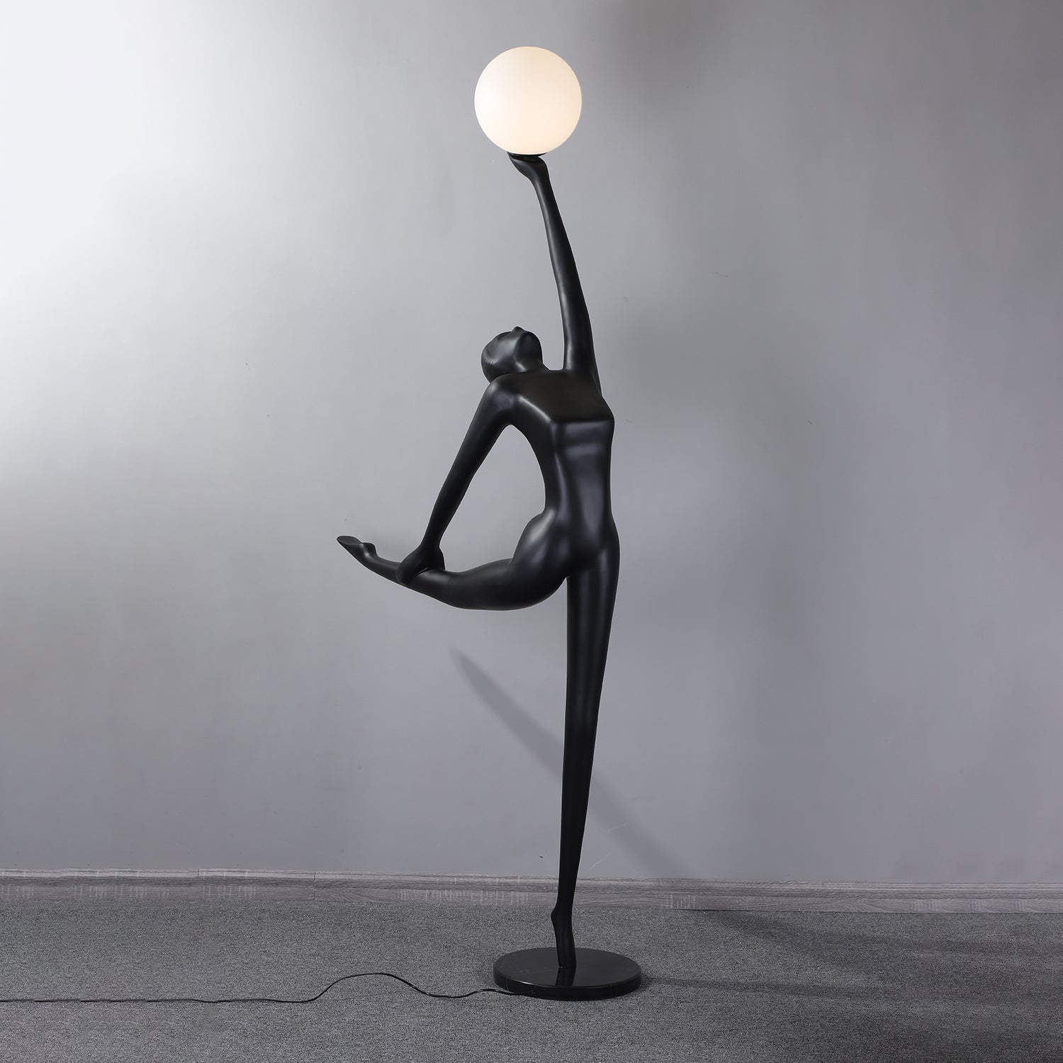 The Rhythmic Gymnast Sculpture Floor Lamp embodies the grace and elegance of a gymnast in motion. This striking piece features a sleek, black figure poised in a dynamic pose, capturing the essence of rhythmic gymnastics. The sculpted form gracefully balances, with one hand delicately holding a glowing globe that serves as the lamp. This design seamlessly combines art and functionality, providing a sophisticated lighting solution that doubles as a stunning artistic statement. Perfect for modern and contemporary interiors, this floor lamp adds a touch of elegance and artistic flair to any space.