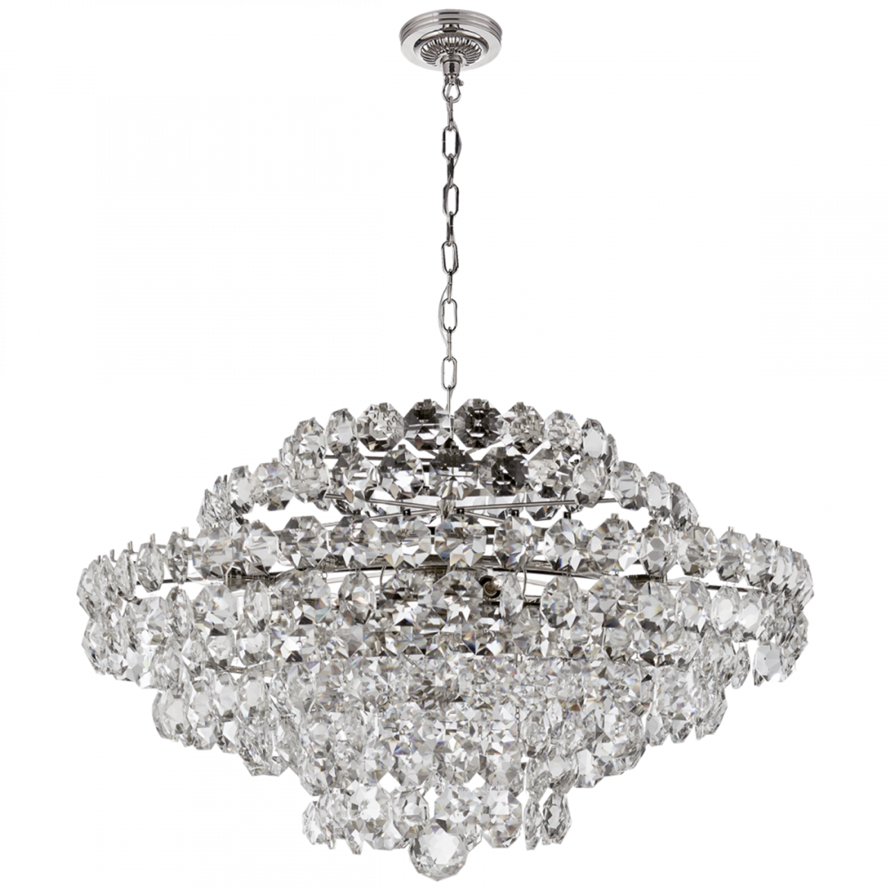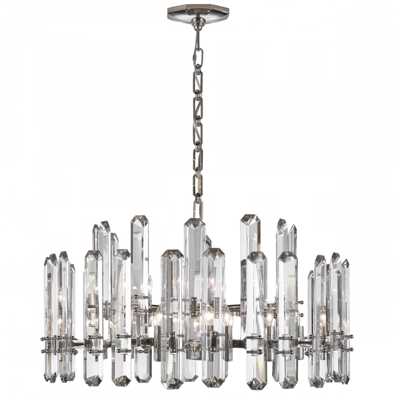 The Sanger by AERIN conveys timeless elegance with dramatic aplomb. Boldly updating the classic chandelier, multifaceted crystals envelope and cascade over a polished nickel frame. The shimmering light from this opulent piece will be ideal over a dining room table.