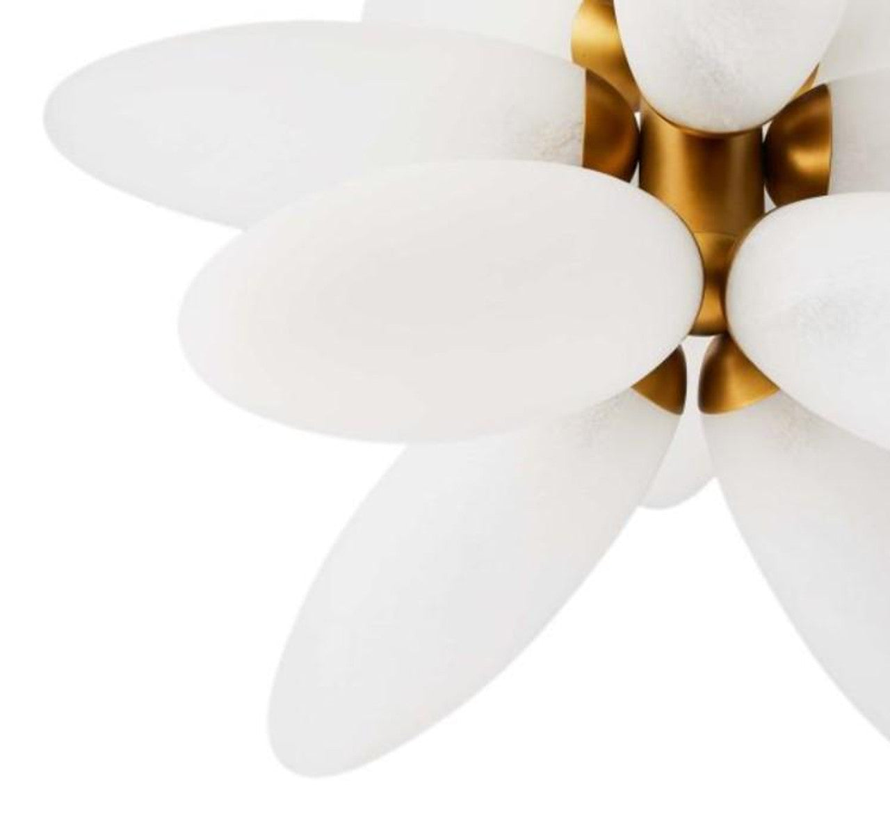 Offering a nod to atomic design, the starling presents a clever twist on the classic sputnik silhouette. The chandelier is rendered as a bundle of elongated ellipsoids in matte white swirl glass attached to a framework of antique brass steel. Finish will vary. damp-rated, although limited covered outdoor areas may affect finish.