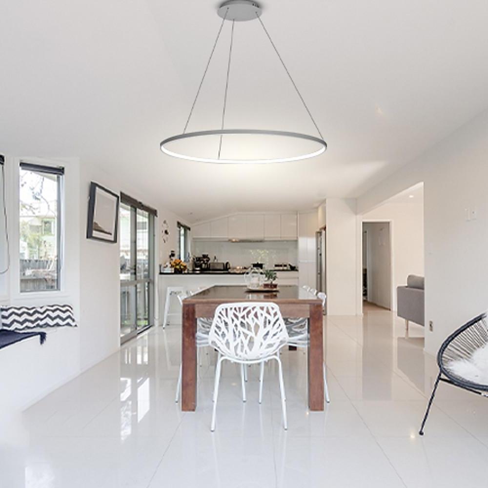 • This Starto Pendant Light features a simple contemporary style with an oversized big ring shape. The integrated LED pendant provides sufficient illumination in your special space, it comes with 38 energy watts, 3000/4500K and 161 sq.ft-215 sq.ft illumination area. This pendant light takes a three metal cable hanging design that is very strong and stable. The LED fixtures are very thin but more energy efficient and last much longer than traditional incandescent versions. The opal shade pendant makes an excellent solution for living room lighting, dining lighting and hallway lighting.