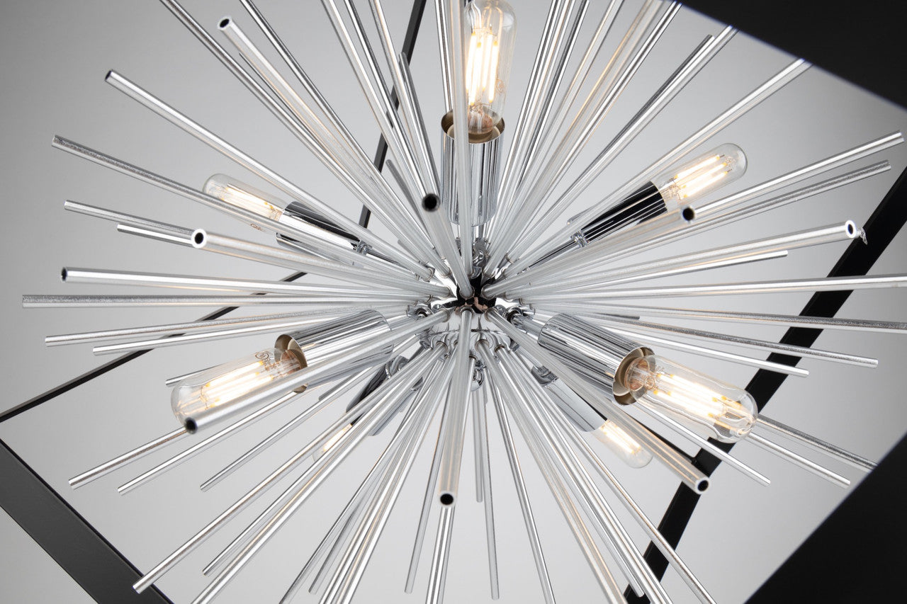 The Sunburst 8-Light Chandelier is unique & a definite beautiful focal point. The exterior frame is matte black encasing a satin brass cluster of thin hollow rods.