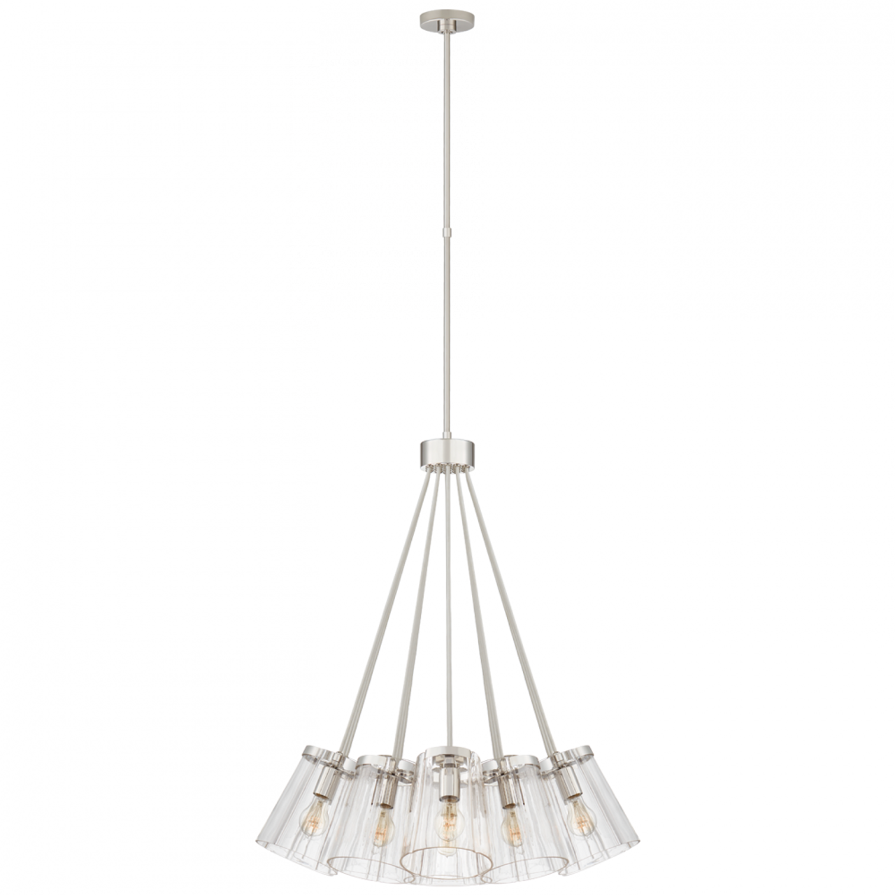 The Thoreau Large Chandelier by Visual Comfort Signature, designed by Kate Spade New York, is a stunning statement piece that combines modern elegance with timeless sophistication. With an overall height of 72.75” and a width of 45”, this chandelier features 19 bulbs encased in clear glass shades, casting a bright, inviting glow across any space. The striking design blends clean lines with a luxurious finish, making it the perfect centerpiece for grand entryways, dining rooms, or any room in need of dramatic lighting.