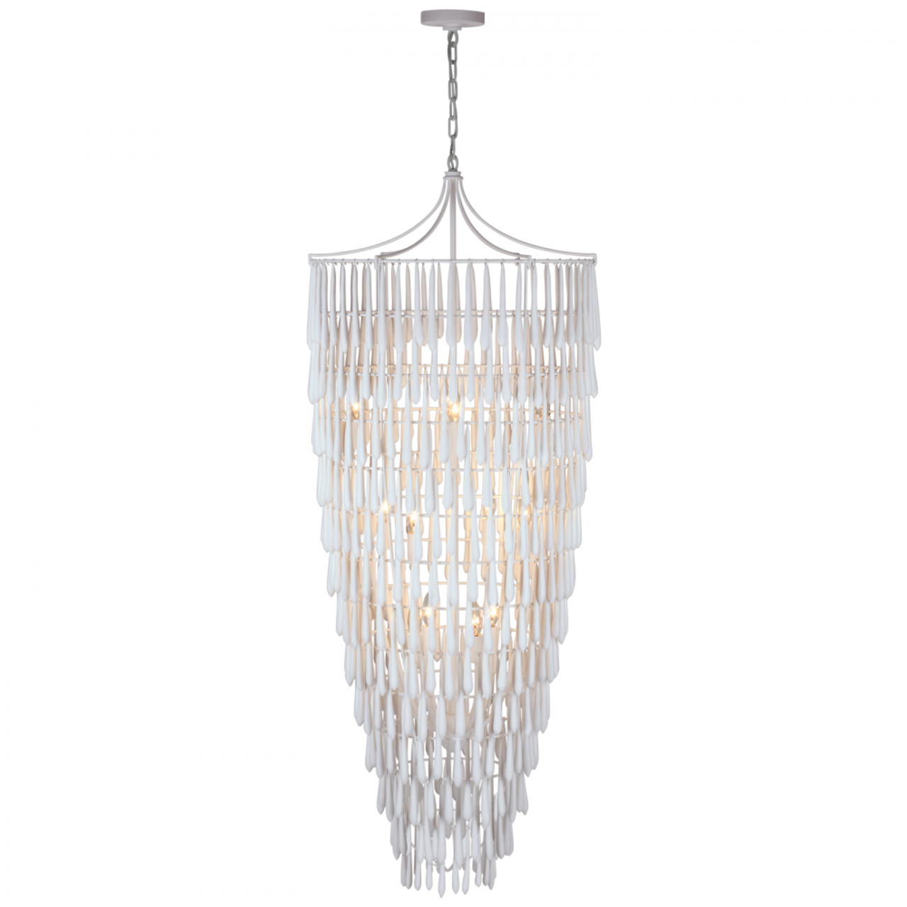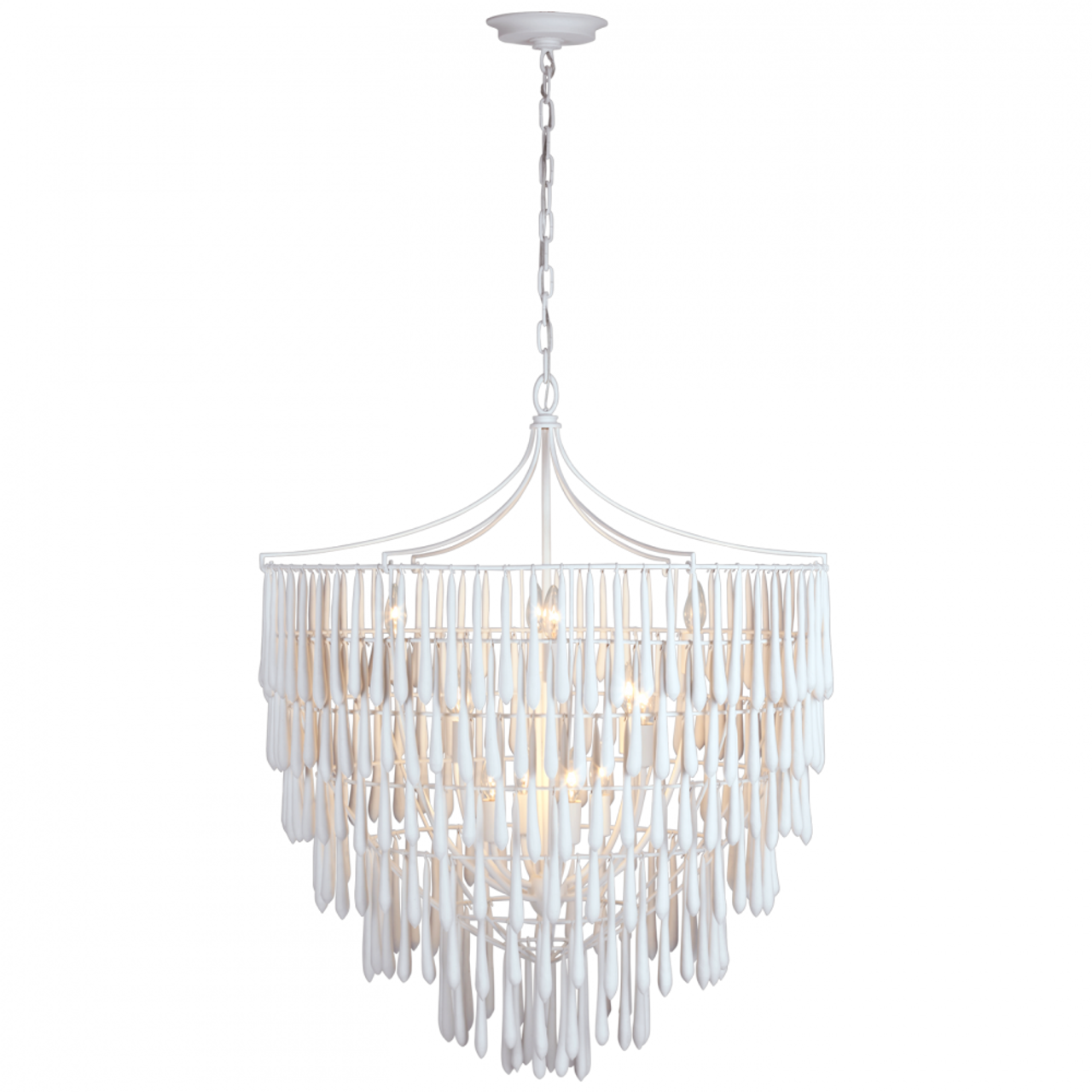 The Vacarro by Julie Neill transforms classic basket chandeliers into a new and unique design statement. Hanging from the basket frame are sculptural, elongated plaster teardrops that create an unexpected texture while light emanates from within the basket. Available in all white or with a metallic finish, the fixtures will transform the space over a dining room table, in an entryway, family room or even bedroom.