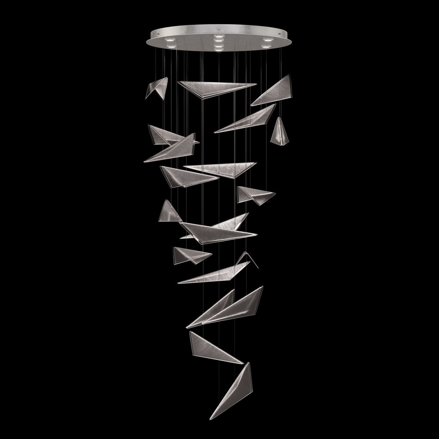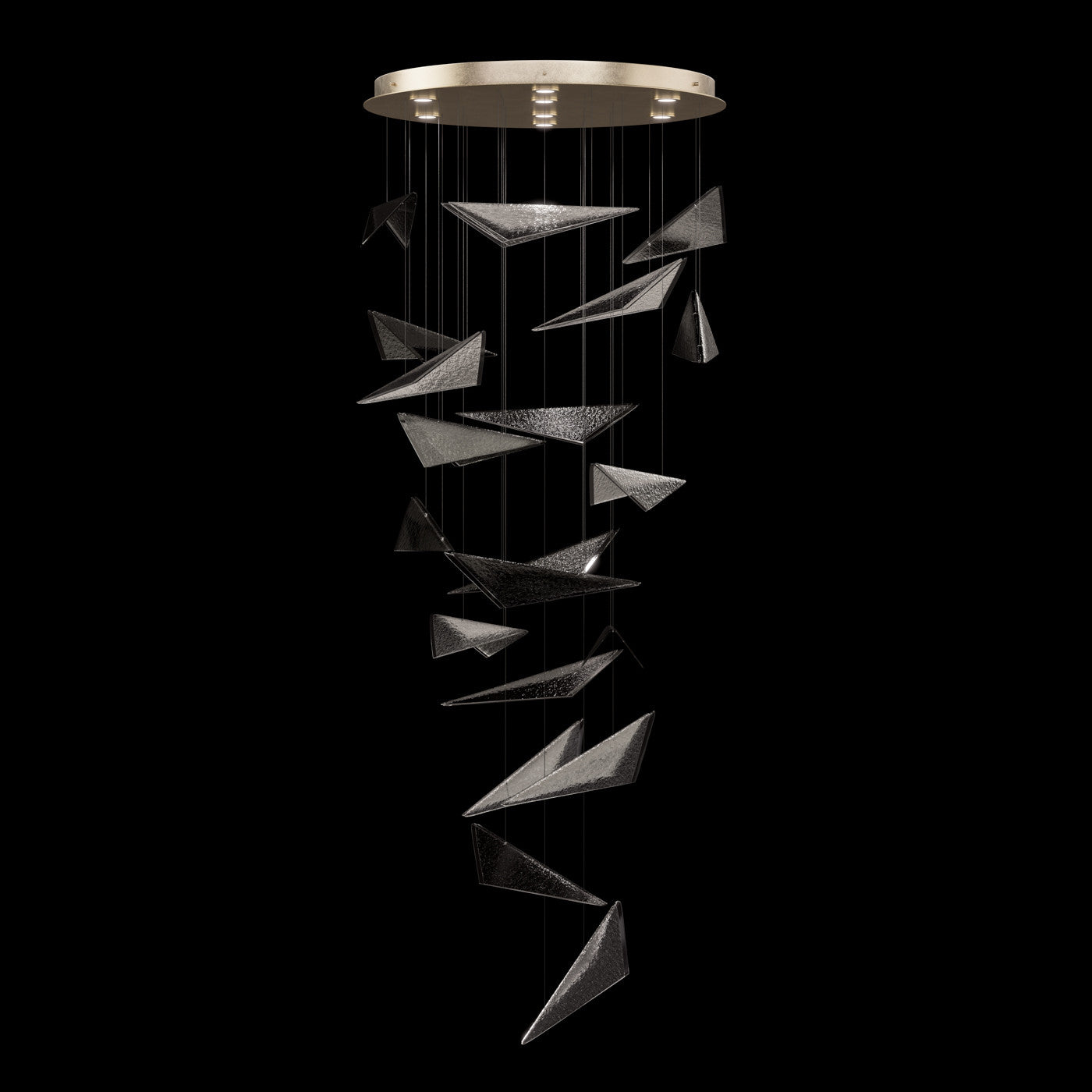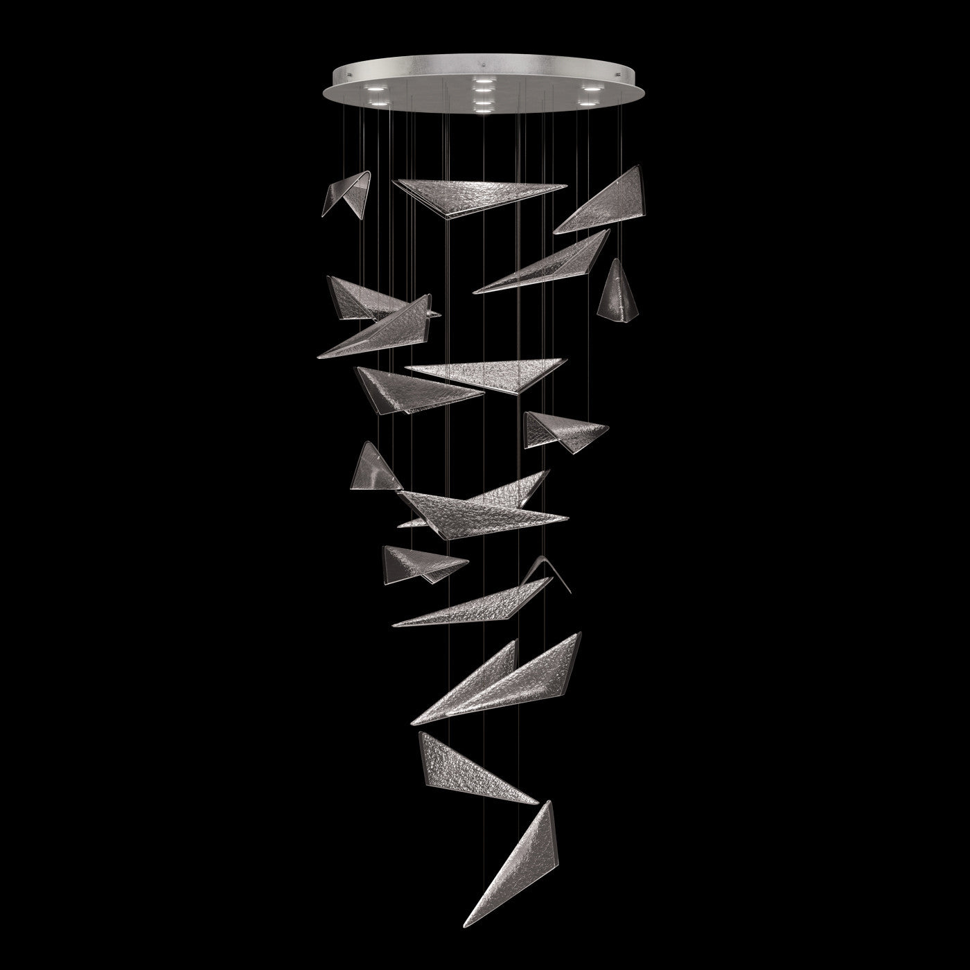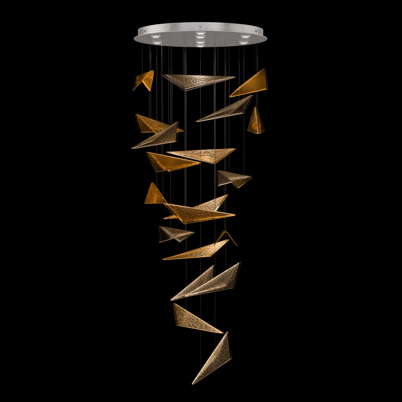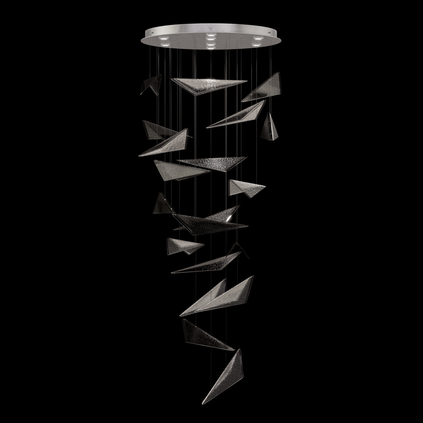 Our Volo Collection captures the quiet momentum of flight through cascading geometric forms and customizable, suspended compositions. Handcrafted studio glass—available in clear, smoke, or amber with hammered or linear textures—evokes the interplay of wind, light, and elevation with striking elegance.