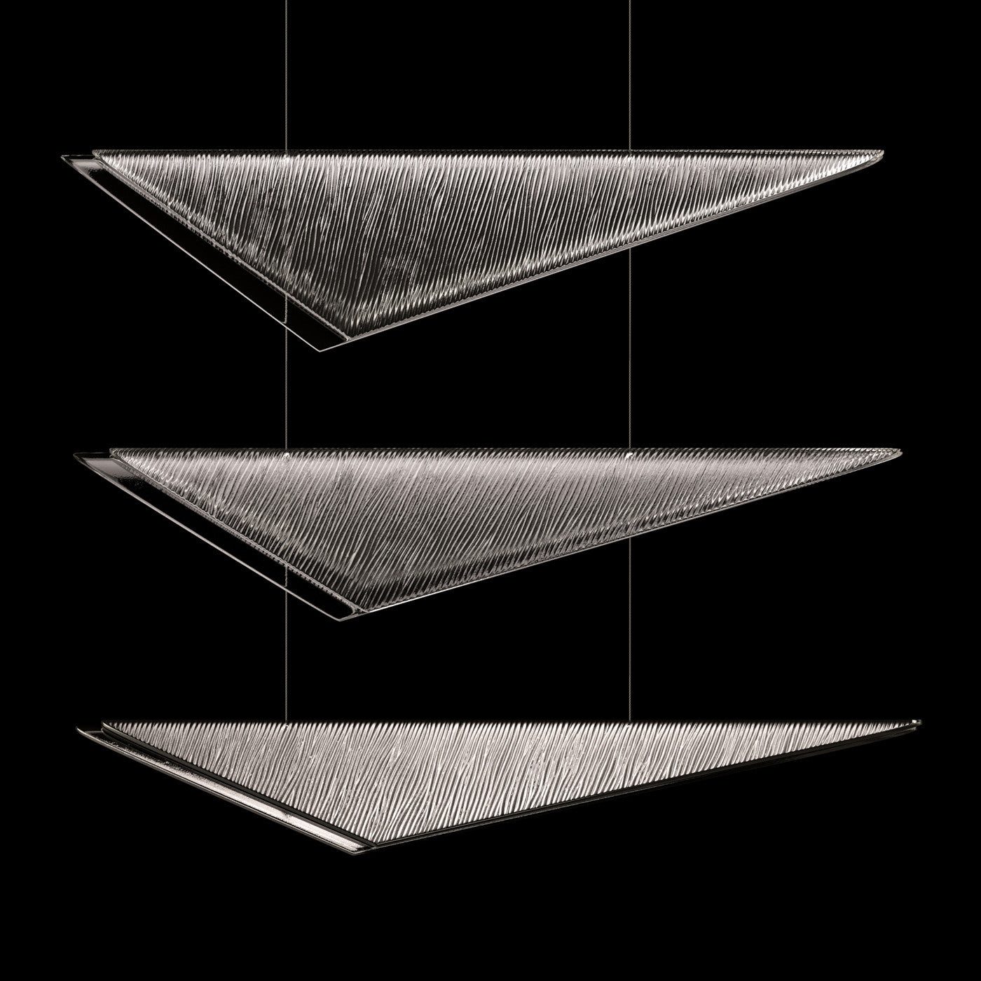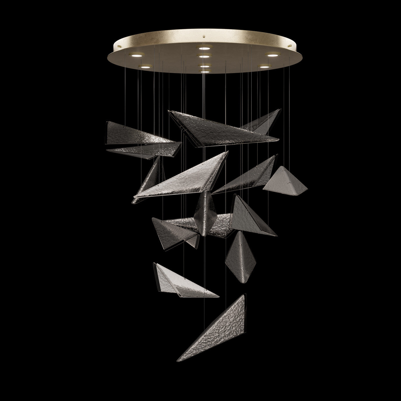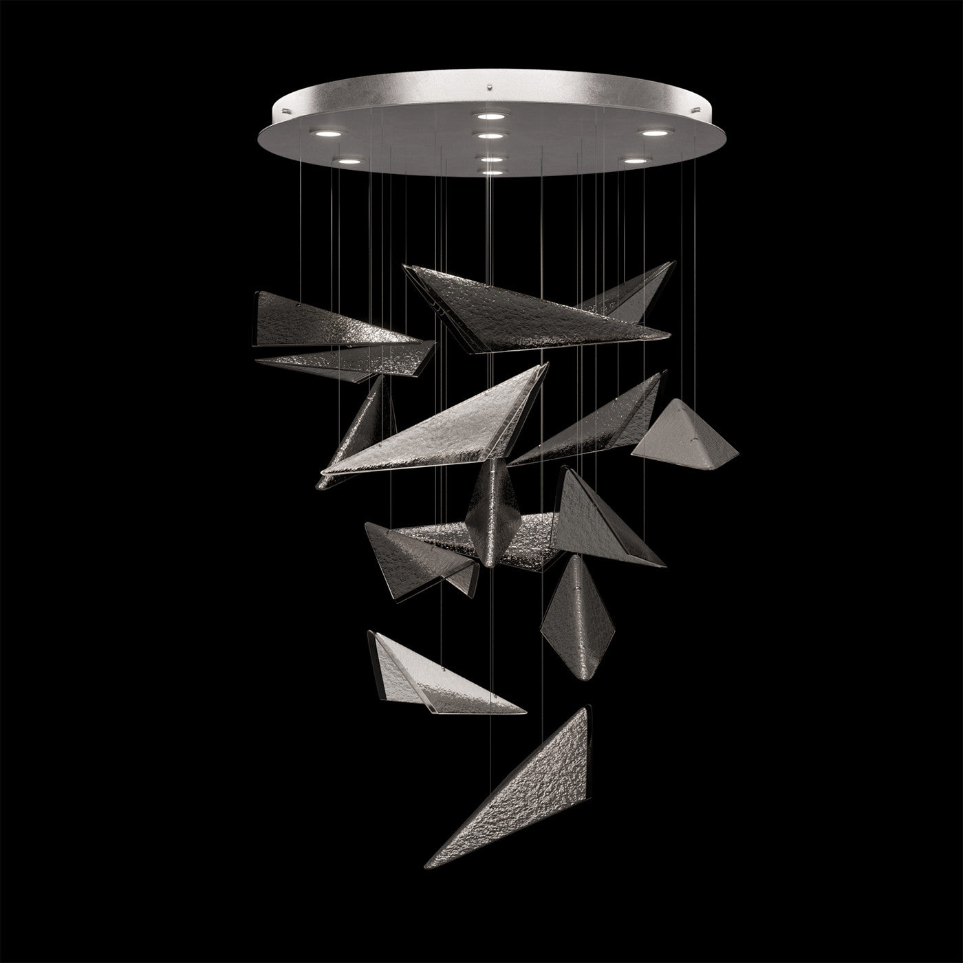 Our Volo Collection captures the quiet momentum of flight through cascading geometric forms and customizable, suspended compositions. Handcrafted studio glass—available in clear, smoke, or amber with hammered or linear textures—evokes the interplay of wind, light, and elevation with striking elegance