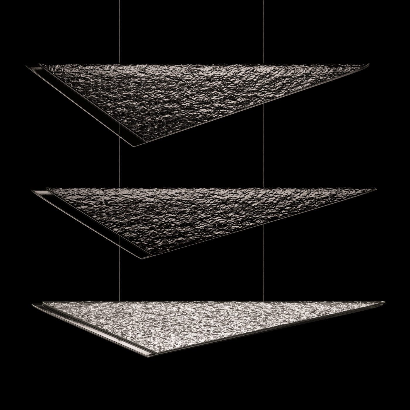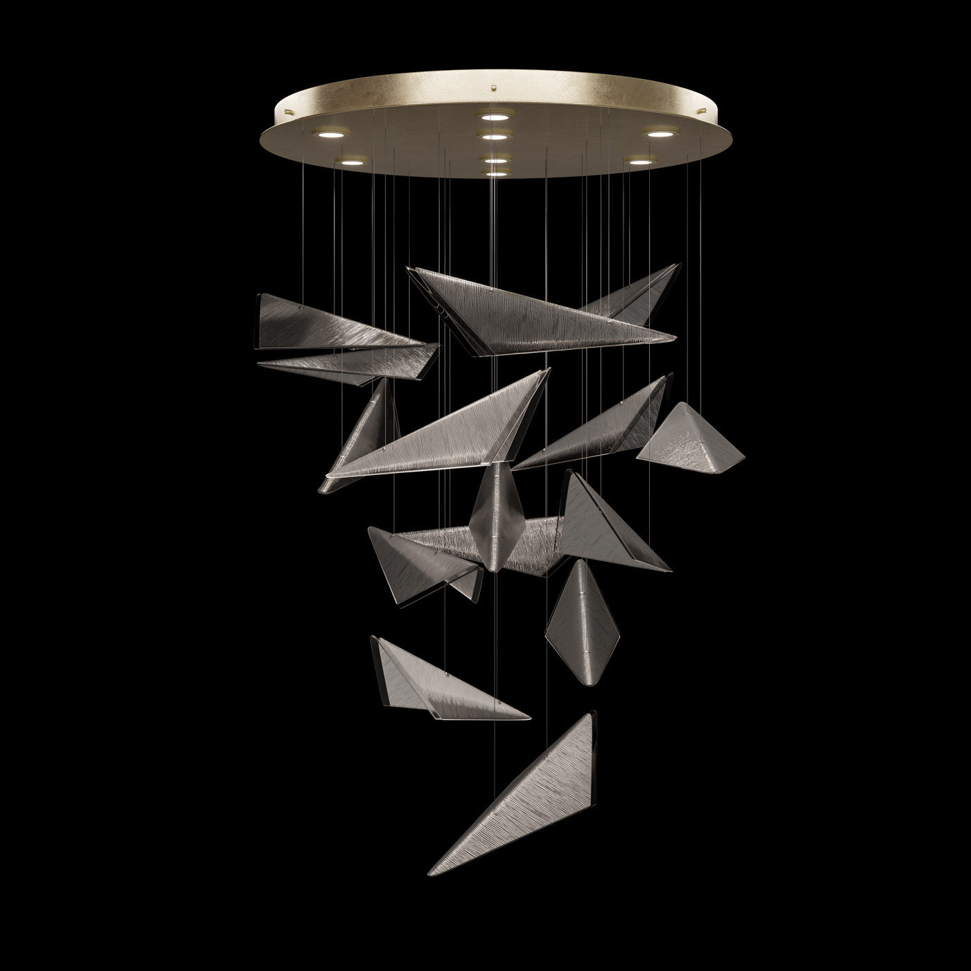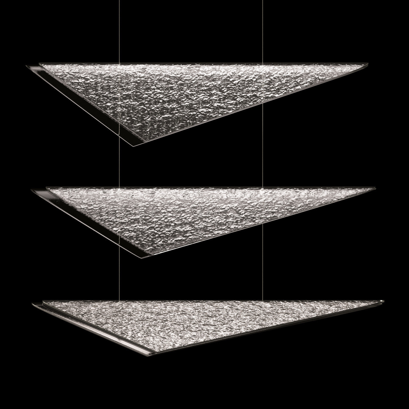 Our Volo Collection captures the quiet momentum of flight through cascading geometric forms and customizable, suspended compositions. Handcrafted studio glass—available in clear, smoke, or amber with hammered or linear textures—evokes the interplay of wind, light, and elevation with striking elegance