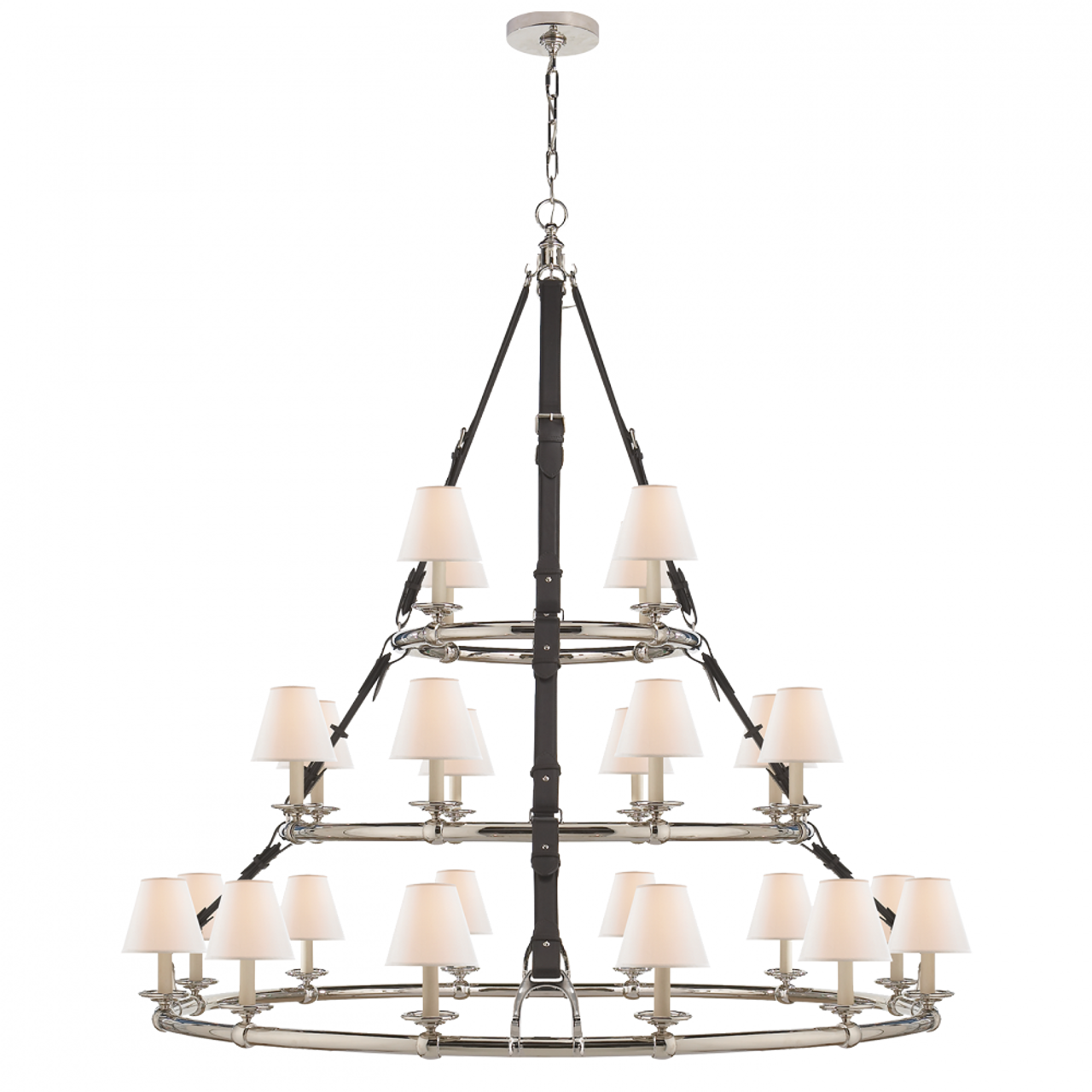 The Westbury by Ralph Lauren offers equestrian elegance for a variety of spaces. Stirrup silhouettes in polished nickel or antiqued brass are elegantly punctuated with leather detailing. Larger models will provide a focal point for dining rooms or entryways, and smaller pieces in multiples will illuminate hallways or great rooms.