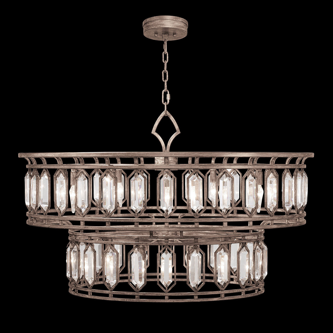 Pendant thoughtfully designed to be both boldly dramatic and quietly subtle. Double-faced beveled crystals exquisitely float openly in individual metal frames. Available in Silver and Gold finish. Both aged finishes lend a casual elegance to today's interior styles.