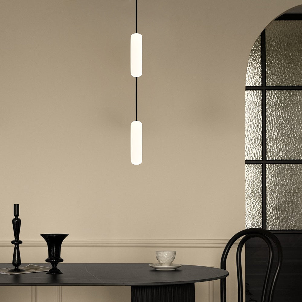 • The white long tube Cluster Pendant is a hand-blown frosted PE pendant with a refined cylinder shape and subtle metal accents. Inside the tube is an LED light that offers bright, even light in all directions.